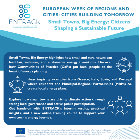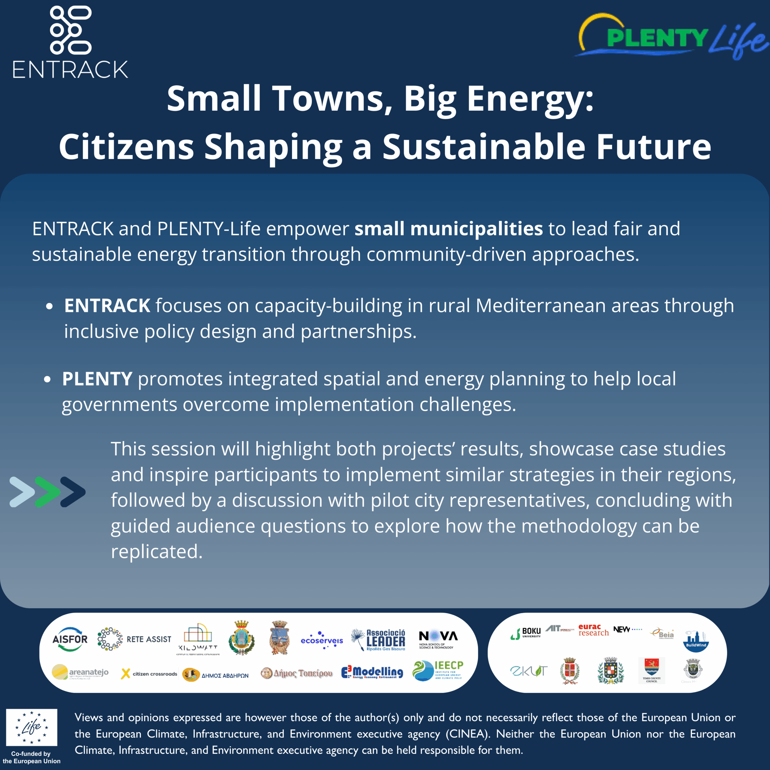 ENTRACK and PLENTY-Life empower small municipalities to lead fair and sustainable energy transition through community-driven approaches. ENTRACK focuses on capacity-building in rural Mediterranean areas through inclusive policy design and partnerships. PLENTY promotes integrated spatial and energy planning to help local governments overcome implementation challenges. This session will highlight both projects’ results, showcase case studies and inspire participants to implement similar strategies in their regions, followed by a discussion with pilot city representatives, concluding with guided audience questions to explore how the methodology can be replicated.